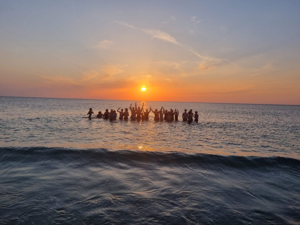 Natürlich waren die Abende wie immer abwechslungsreich: Mottodiskos (Mafia, Neon, Mehrlinge), Kinoabende, Workshops von Tanzen über Basteln bis Fußball, für jede und jeden war etwas dabei. Dabei wurde unser Clubtanz überall getanzt: im Camp, am Strand, auf demSportplatz und natürlich in der Disko. Das absolute Highlight war das gemeinsame Schwimmen in den Sonnenuntergang, bis die Sonne im Meer versank. Unvergesslich. Am letzten Abend hieß es dann „Glitzer und Glamour“ in feinen Roben, alle ein bisschen wehmütig, dass die Freizeit schon fast vorbei war.